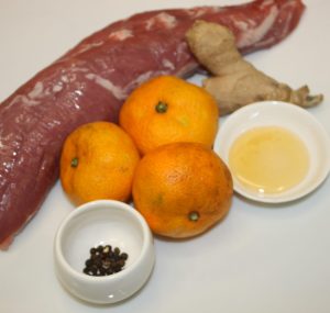 En una bolsa hermética poner el solomillo, zumo de las mandarinas, jengibre y bolas de pimienta. Macerar 12 horas.