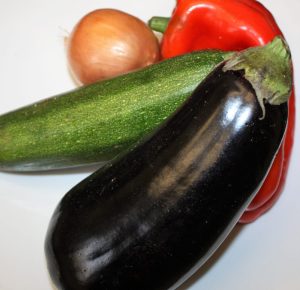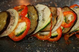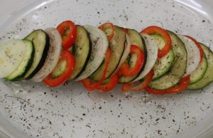 En una fuente de horno ir alternando las rodajas de las verduras. Colocar entre ellas un poco de tomillo. Regar con dos cucharadas de aceite virgen extra y salpimentar.