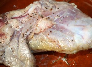 Poner en una fuente de horno y regar con el aceite, tomillo, sal y pimienta. Añadir las hojas de laurel encima.