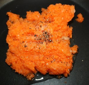 En una sartén con 4 cucharadas de aceite rehogar el ajo, cebolla y zanahoria picados. Salpimentar. 10 minutos a fuego medio-bajo. Mover de vez en cuando para que no se queme.