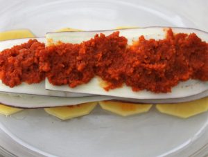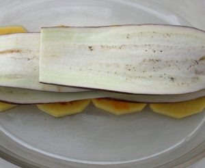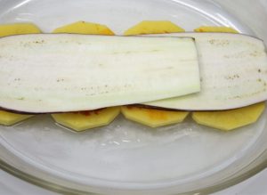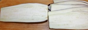 Quitar las puntas de las berenjenas, cortar en rodajas a lo largo de aproximadamente medio cm. Si os resulta más fácil hacer rodajas redondas. Solo vamos a utilizar 4. Con el resto podéis hacer por ejemplo un pisto.