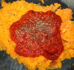 Añadir el tomate frito y espolvorear con tomillo. Dejar otros 10 minutos con el fuego al mínimo.