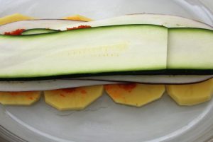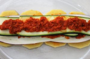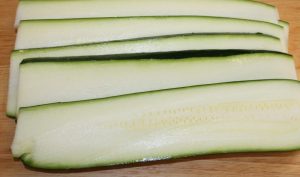 Quitar las puntas del calabacín y cortar también en rodajas longitudinales del mismo tamaño que las de berenjena. Vamos a utilizar 2. Con las demás hacer lo mismo que con la berenjena, un pisto.