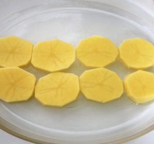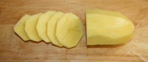 Pelar las patatas y cortar en rodajas del mismo tamaño que las verduras.