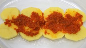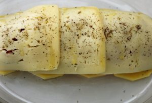 9.Terminar colocando las lonchas de queso, un poco de sal, tomillo y unas gotas de aceite de oliva virgen extra.