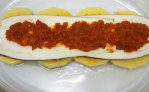 Poner en una fuente de horno una cucharada de aceite de oliva para untar el fondo y que no se nos pegue la musaka. Comencemos a montarla!!!