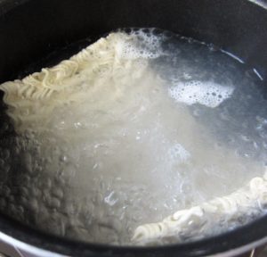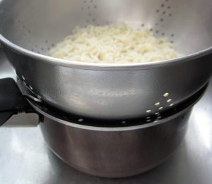 Mientras tanto cocer los noodles siguiendo las instrucciones del fabricante. Suelen ser solo 4 minutos desde que el agua comience a hervir. Poner una pizca de sal.