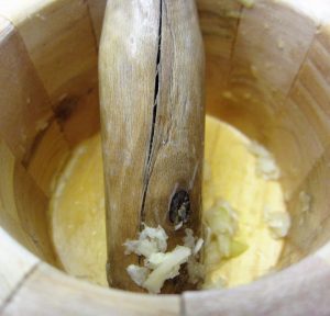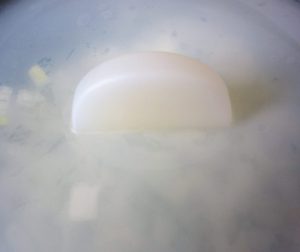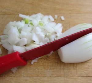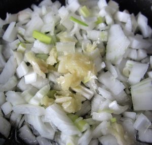 En una sartén con 4 cucharadas de aceite pochar la cebolla y el ajo. Añadir una pizca de sal.