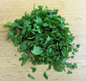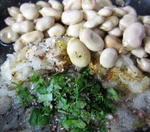 Destapar la sartén y añadir el perejil, jengibre, cúrcuma, pimienta y las habitas.