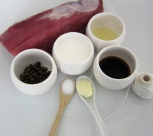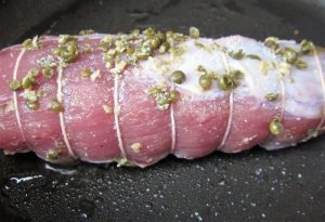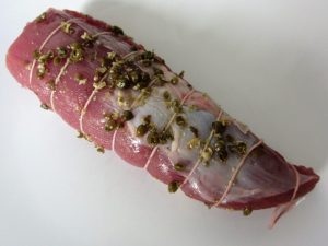 Atar el solomillo con hilo de cocina ( bramante ). Lo podéis comprar en cualquier chino o tienda de productos de cocina. Salar y untar con la mitad de la pimienta majada.