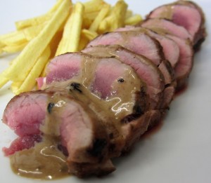 Quitar el hilo de la carne. Cortar en rodajas gruesas y servir con la salsa.