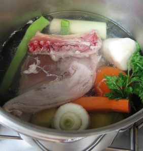 Vamos a hacer un caldo suave de pollo y verduras que utilizaremos para un arroz meloso. Luego os daré la receta.