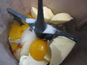 Colocar la mariposa y añadir al vaso los huevos, mantequilla, azúcar y extracto de vainilla.