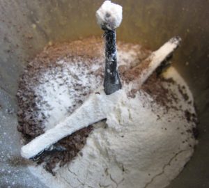 Añadir la harina y levadura, tamizadas con un colador de malla fina, el chocolate reservado y una pizca de sal.