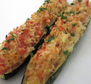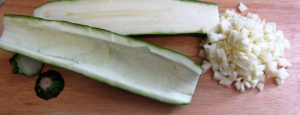 Quitar los extremos del calabacín, cortarlo longitudinalmente y vaciar la pulpa con una cuchara o un cuchillo.