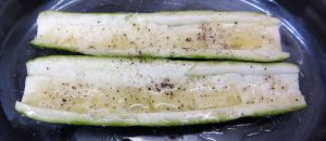 En una fuente de horno poner dos cucharadas de aceite. Colocar encima las dos mitades del calabacín y salpimentarlo.