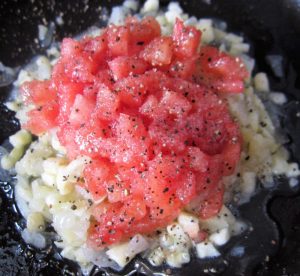 Poner el tomate, volver a salpimentar y añadir el azúcar. 10 minutos a fuego bajo. No os olvidéis de mover de vez en cuando.