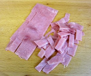 Cortar el jamón en pequeños rectángulos.