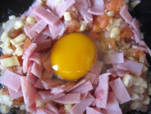 En un bol poner el sofrito, el jamón y el huevo crudo. Remover bien.