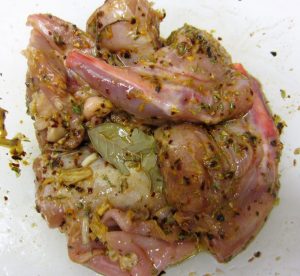 Con este adobo impregnar bien el conejo, añadir la hoja de laurel y meter en la nevera tapado con film. Dejar por lo menos 12 horas. Mover un par de veces.