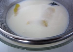 Poner un cazo al fuego con la leche, el anís, canela, piel de limón y azúcar.