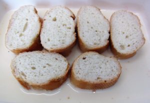 Cortar el pan en rebanadas de 2 cm. Colocar en una fuente y verter sobre ellas la leche.