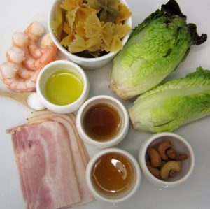 Esta ensalada la podéis tener hecha y en el último momento simplemente pasar por la sartén las tiras de beicon y los langostinos y aderezar con la vinagreta que ya tendremos preparada.