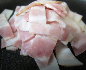 Cortar el beicon en tiras anchas y freír en una sartén sin nada de aceite ya que el beicon ya suelta bastante. 4 minutos a fuego fuerte. Mover para que se haga bien por todos los lados y no se queme. Debe quedar bien crujiente.