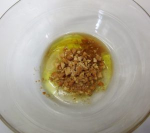 En un bol poner el aceite virgen, el vinagre, la miel, los anacardos y una pizca de sal. Batir bien.
