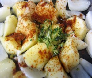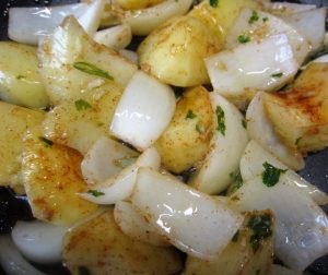 En una sartén con el aceite poner la patata, cebolla y sal ( reservar un poco para salar la raya ).