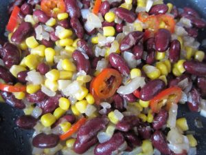 Momento de poner los frijoles y el maíz ( previamente enjuagados ambos para que pierdan el sabor a conserva ). Subir a fuego medio y mezclar bien.