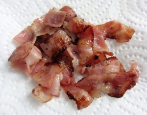 Cortar la loncha de beicon en tiras y dorar en una sartén sin nada de aceite. Ponerlo cuando la sartén esté bien caliente.