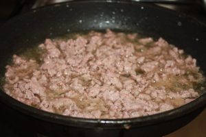En una sartén con 5 cucharadas de aceite y fuego fuerte poner la carne.