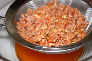 Colar y no tirar el aceite, lo vamos a utilizar para hacer la bechamel.