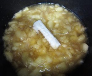 En una olla de fondo grueso cocer los paraguayos troceados con el azúcar, agua y vinagre. 30 minutos con el fuego al mínimo. Durante todo el proceso de elaboración de la mermelada es necesario mover a menudo para que no se queme. Dar golpecitos con la cuchara para que los trozos se vayan deshaciendo. Lo que queremos obtener es un puré en el que se noten los trozos.