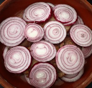 En una fuente apta para el horno, cubrir la base con rodajas de cebolla de medio cm de espesor. Salar.