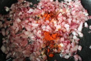 Cuando la cebolla esté muy pochada, añadir el pimentón. Una vuelta y….