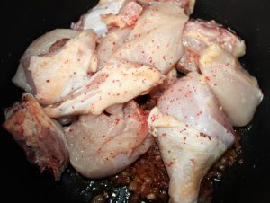 ….poner el pollo. Salpimentar. 5 minutos a fuego medio, moviendo para que el pollo vaya cogiendo color por todos los lados pero sin dorarse.
