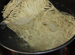 Lo podéis acompañar de unos noodles. Para cocerlos seguir las instrucciones del fabricante ( suelen ser 4 minutos en agua hirviendo con sal ).