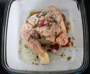 En una fuente de horno poner el pollo con 4 cucharadas de aceite, 1 cucharada de soja, sal, pimienta, cayena, tomillo, romero, laurel, el ajo con piel, partido por la mitad, y el zumo de medio limón.