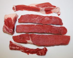 Quitar todos los bordes que contienen grasa para dejar solamente el centro, más o menos rectangular, y cortar en tres tiras. Como las partes que no vamos a utilizar todavía contienen carne, no se os ocurra tirarlas!!!!, picarlas y utilizarlas para otro plato, unos macarrones, albóndigas, lasaña, berenjenas rellenas…. Si queréis esto lo podéis hacer con antelación y congelar.