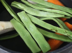 Vamos a elaborar un caldo de verduras muy sencillo: pelar la chirivía, nabo y zanahoria. Cortar los extremos de las judías. Introducir todas las verduras en una olla con 250 ml de agua y una cucharadita de sal. Dejar cociendo 30 minutos. Colar y reservar el caldo.