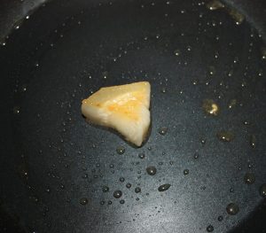 En una sartén bien caliente poner el trozo de tocino. Ir moviéndolo para que vaya soltando la grasa. Cuando ya tengamos una pequeña capa de grasa, eliminar el tocino y añadir una cucharada de aceite de girasol. Bajar el fuego.