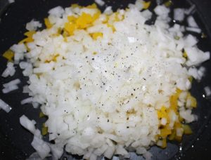 Añadir a la sartén el pimiento y la cebolleta picados. Salpimentar. 5 minutos a fuego medio. Mover de vez en cuando.