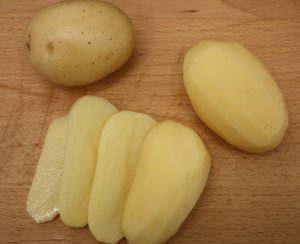 Cortar la vaina de vainilla por la mitad y raspar para sacar las semilla que son las que aportan todo el aroma. Añadirlas al aceite. Dejar confitando las patatas, en el aceite con la vainilla. 10 minutos con el fuego al mínimo.