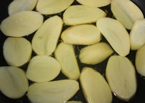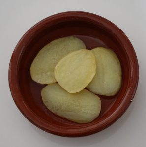 Colocar 4 rodajas de patata en cada cazuelita, con un poco del aceite de confitarlas. Como os he dicho antes lo podéis hacer en una cazuela grande.