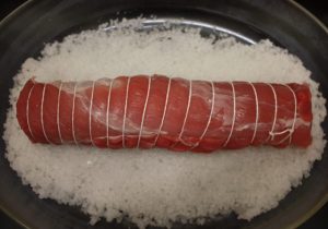 En una fuente de horno colocar una capa de sal. Poner encima el solomillo.