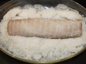 Sacar del horno y dejar enfriar. Dar unos golpes y veréis como la sal, que se ha endurecido en el horno, se desprende con facilidad. Eliminar con las manos la sal que ha quedado pegada y cortar el hilo. Como veis no hemos puesto sal ya que la carne ya habrá absorbido suficiente al estar horneada dentro de ella.