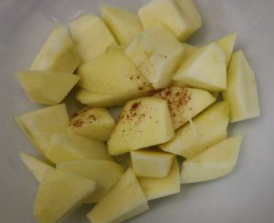 Pelar la manzana y cortarla en trozos. Ponerla en un bol con una pizca de canela.