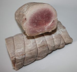 Cortar los extremos del solomillo de cerdo ya que queremos que al laminarlo, todas las cortadas sean aproximadamente del mismo tamaño. Nos quedarán unos 500 g.